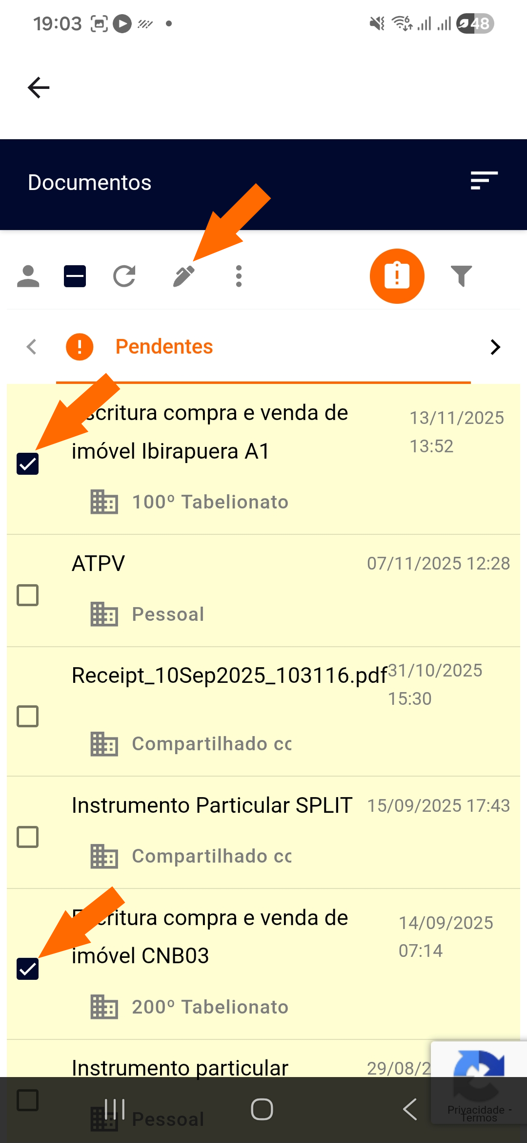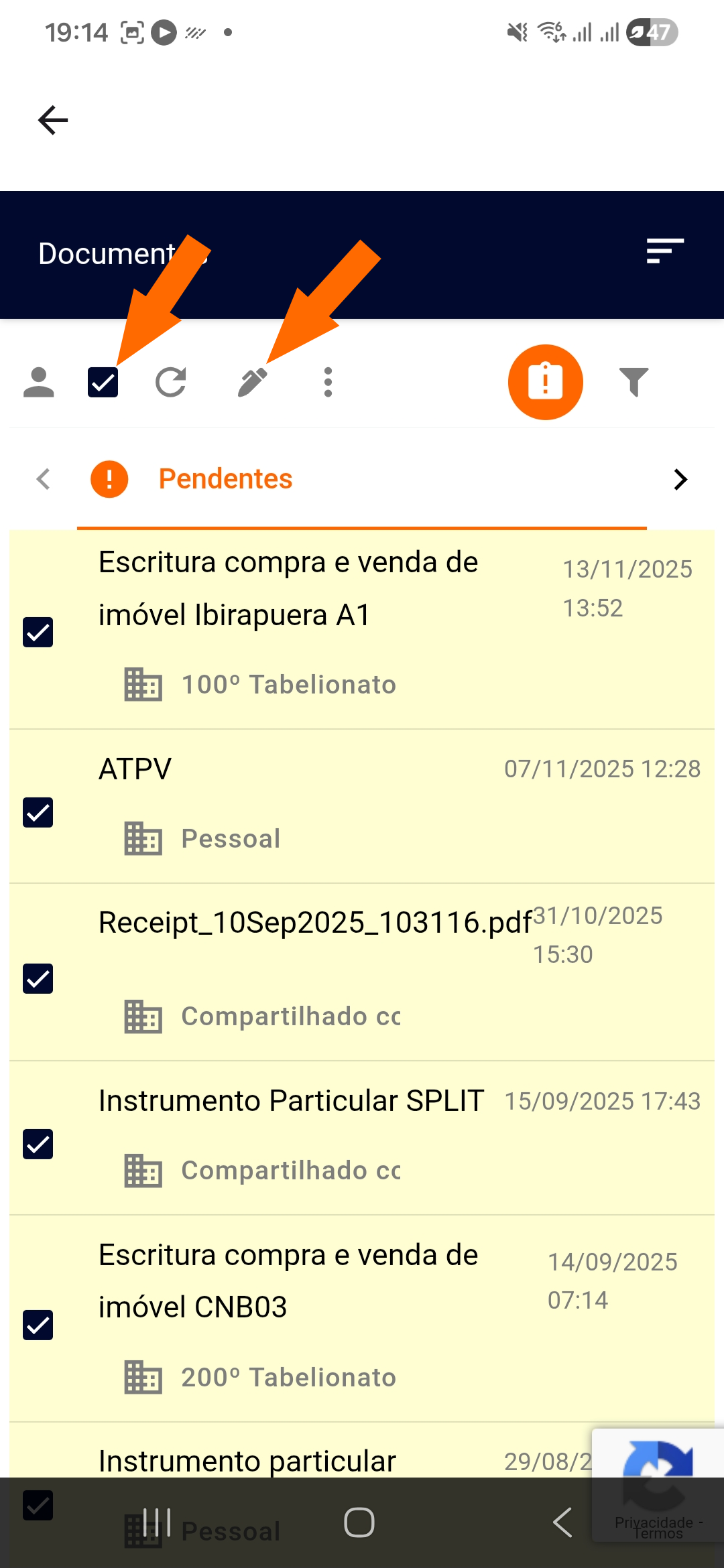 | OPÇÃO 1: Assinar somente alguns documentos Para assinar mais de um documento por vez, marque os documentos que deseja assinar e depois clique no ícone da caneta ![]() | OPÇÃO 2: Assinar todos os documentos pendentes Se desejar assinar todos os documentos pendentes, marque todos pela opção do cabeçalho e depois clique no ícone da caneta ![]() |