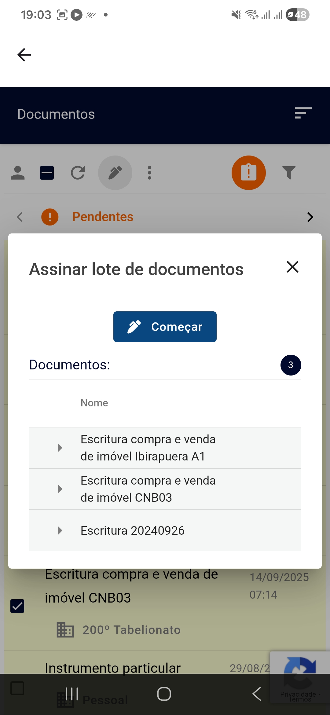 Serão relacionados os documentos selecionados para assinatura. Clique em 'Começar'.![]() | Clique em 'Assinar'![]() |