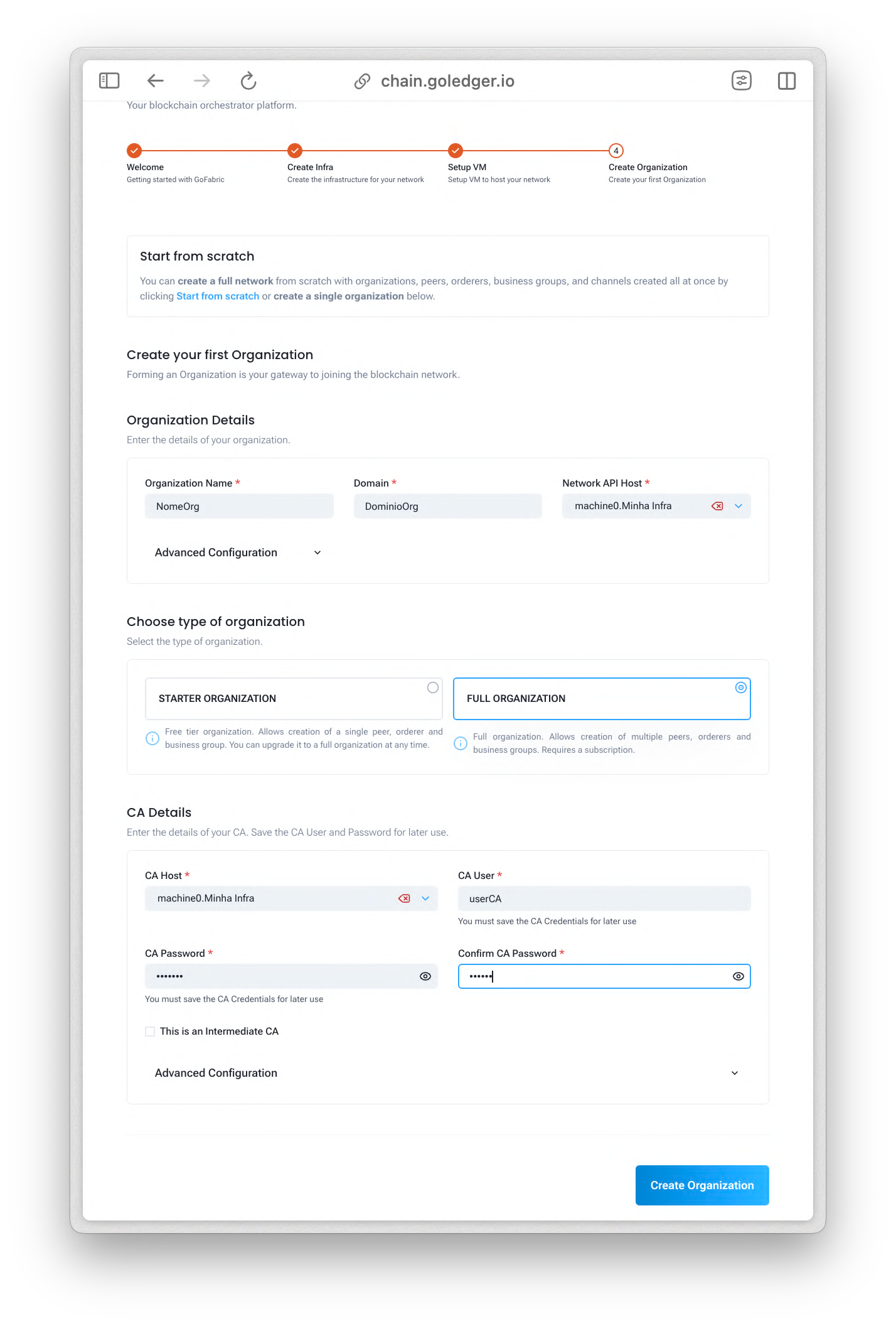Com a máquina virtual configurada, é hora de criar a organização. Para isso preencha o formulário com as seguintes informações: