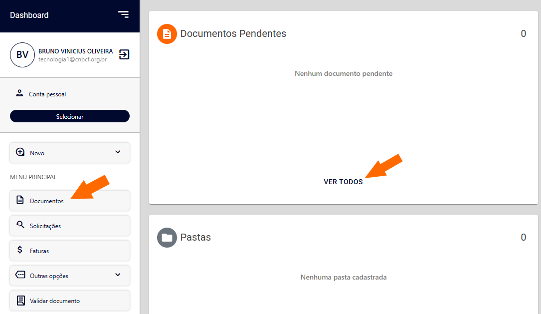Após o login, serão apresentados os documentos pendentes. Para verificar os documentos pendentes de assinatura, clique em 'VER TODOS' no quadro de 'Documentos Pendentes' ou na opção 'Documentos' do menu lateral.