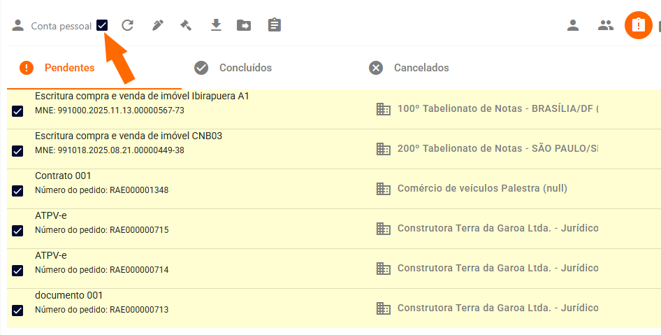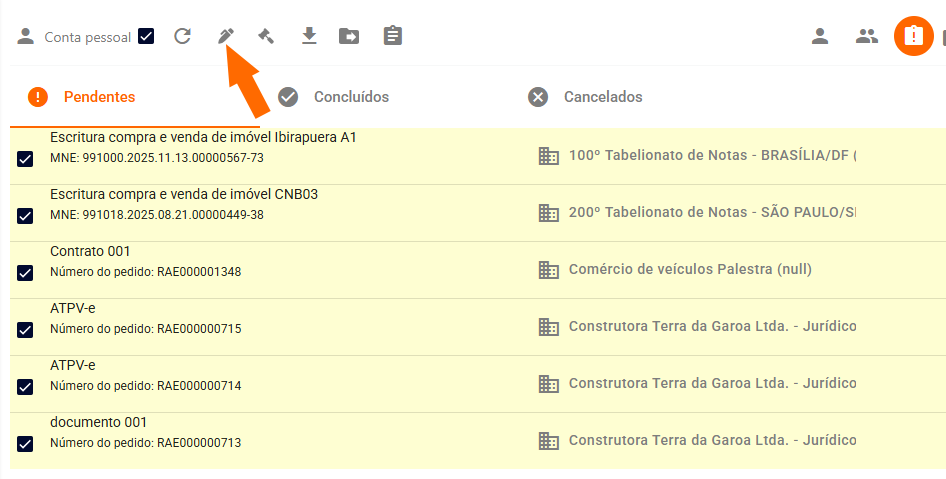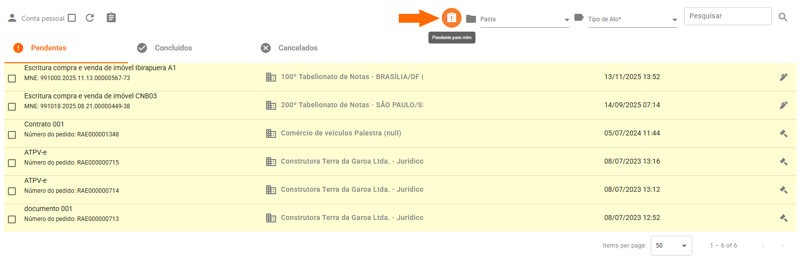 Para filtrar somente os atos pendentes de sua assinatura digital, clique sobre o ícone 'Pendente para mim'.