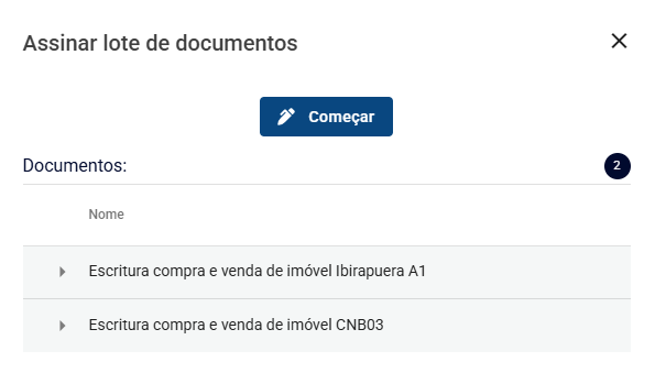 Serão relacionados os documentos selecionados. Clique em 'Começar'.