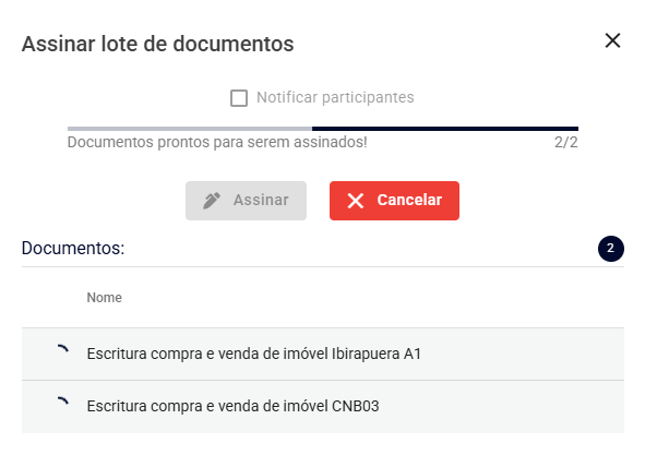 Para assinar em lote, marque todos ou selecione os documentos desejados individualmente.