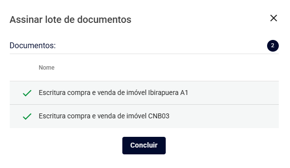 Após a confirmação das assinaturas, o sistema indicará que os documentos foram assinados. Clique em 'Concluir'.