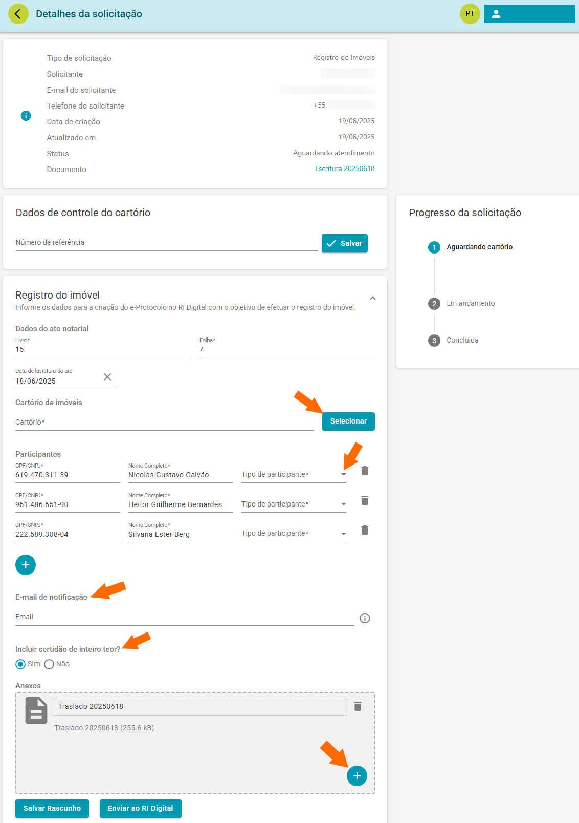 Para cada solicitação de registro de imóvel criada, complemente os dados requeridos, conforme listado a seguir: