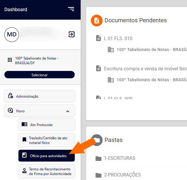 Entre as opções exibidas, selecione 'Ofício para autoridades'.
