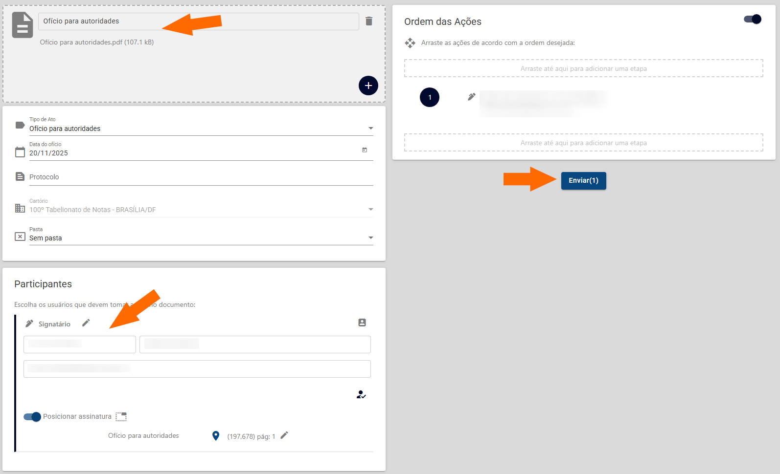 Anexe o ofício em formato PDF, informe o signatário que assinará com o certificado digital ICP-Brasil, posicione a assinatura no documento e clique em 'Enviar'.