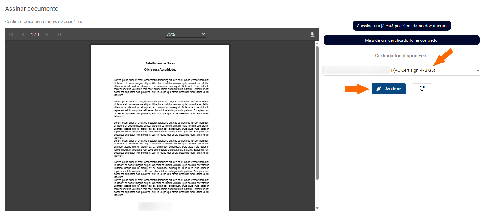 Selecione o certificado digital ICP-Brasil e clique em 'Assinar'. Em seguida, informe o PIN do certificado para autorizar a assinatura.