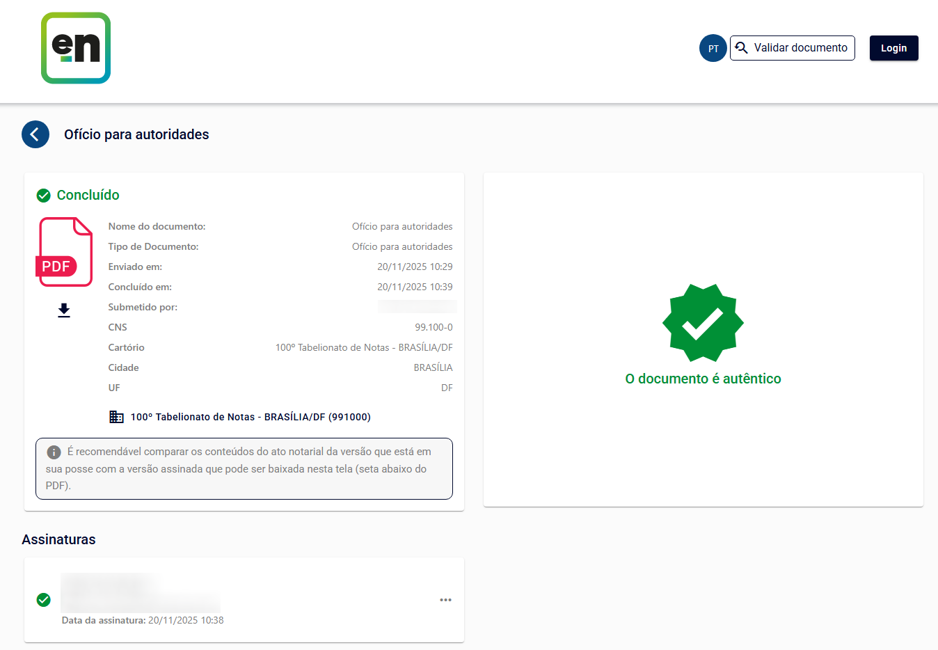 Os ofícios assinados no e-Notariado podem ser verificados quanto à sua autenticidade. Para isto, deve-se acessar docautentico.com.br