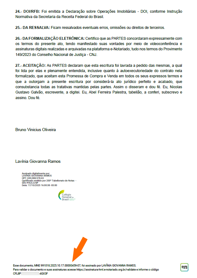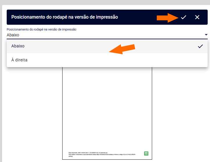 O e-Notariado permite configurar o posicionamento do rodapé da versão de impressão tanto no final da página quanto à direita, com o objetivo de evitar que sobreponha o conteúdo do documento.
