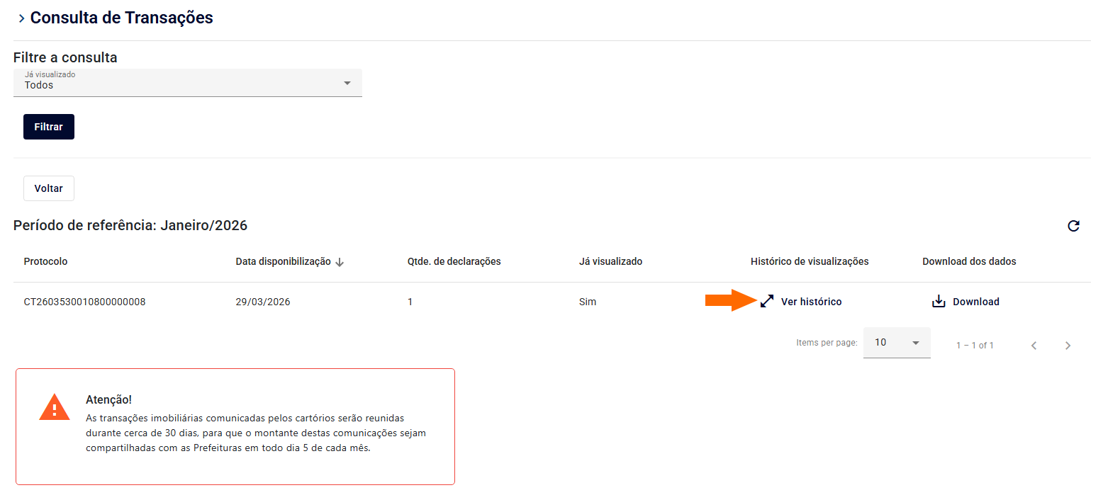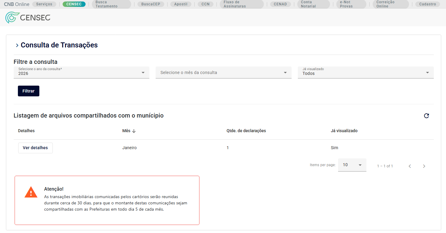 Quando o usuário da prefeitura selecionar 'Tabelionato de Notas', será apresentada a tela da CENSEC para listar os arquivos mensais, conforme os filtros desejados.