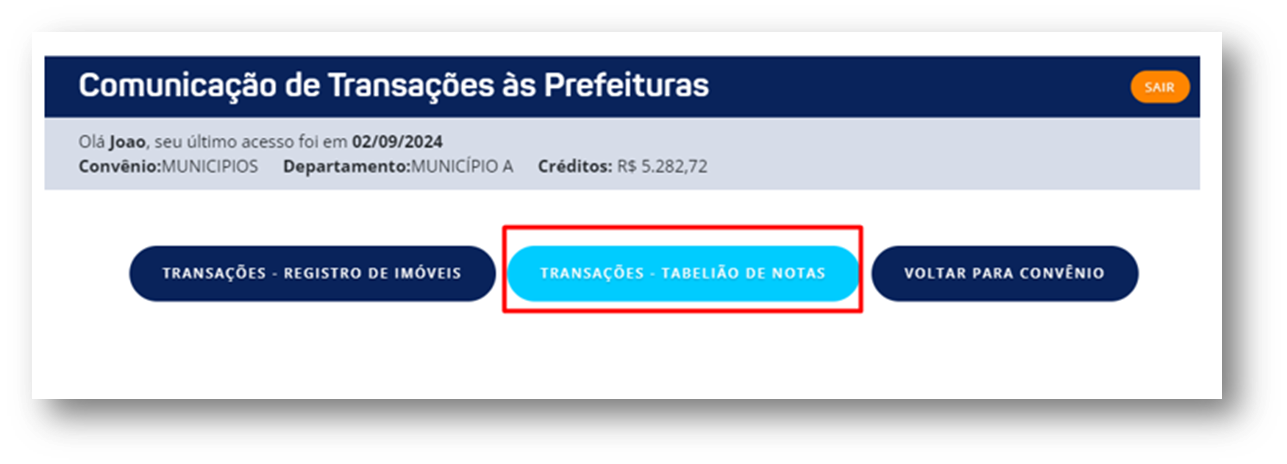 Pelo sistema RI Digital, o usuário da prefeitura deverá clicar em 'Transações - Tabelião de Notas'.